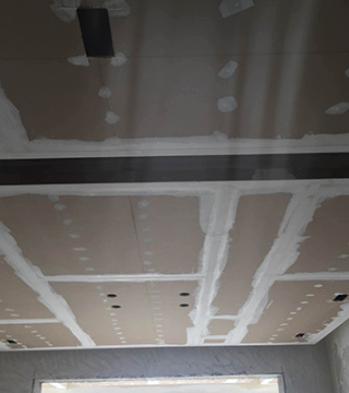 采用轻钢龙骨,石膏板安装牢固、无污染、折裂、缺角、凹痕等缺陷,要留自然缝。
